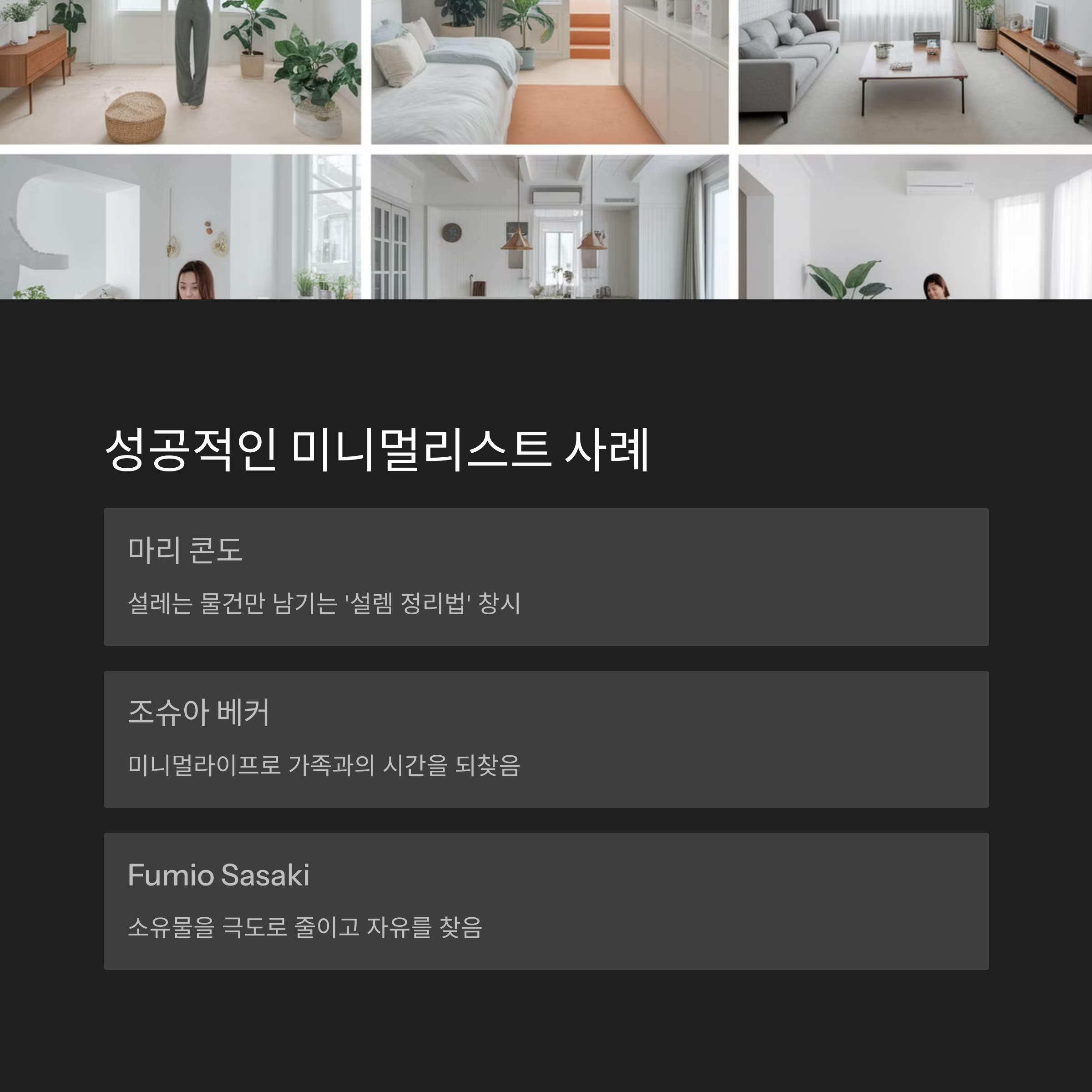 미니멀라이프를 실천한 사람들의 사례를 보면 더욱 동기부여가 될 거예요! 전 세계적으로 미니멀라이프를 통해 더 나은 삶을 찾은 사람들이 많아요. 😊