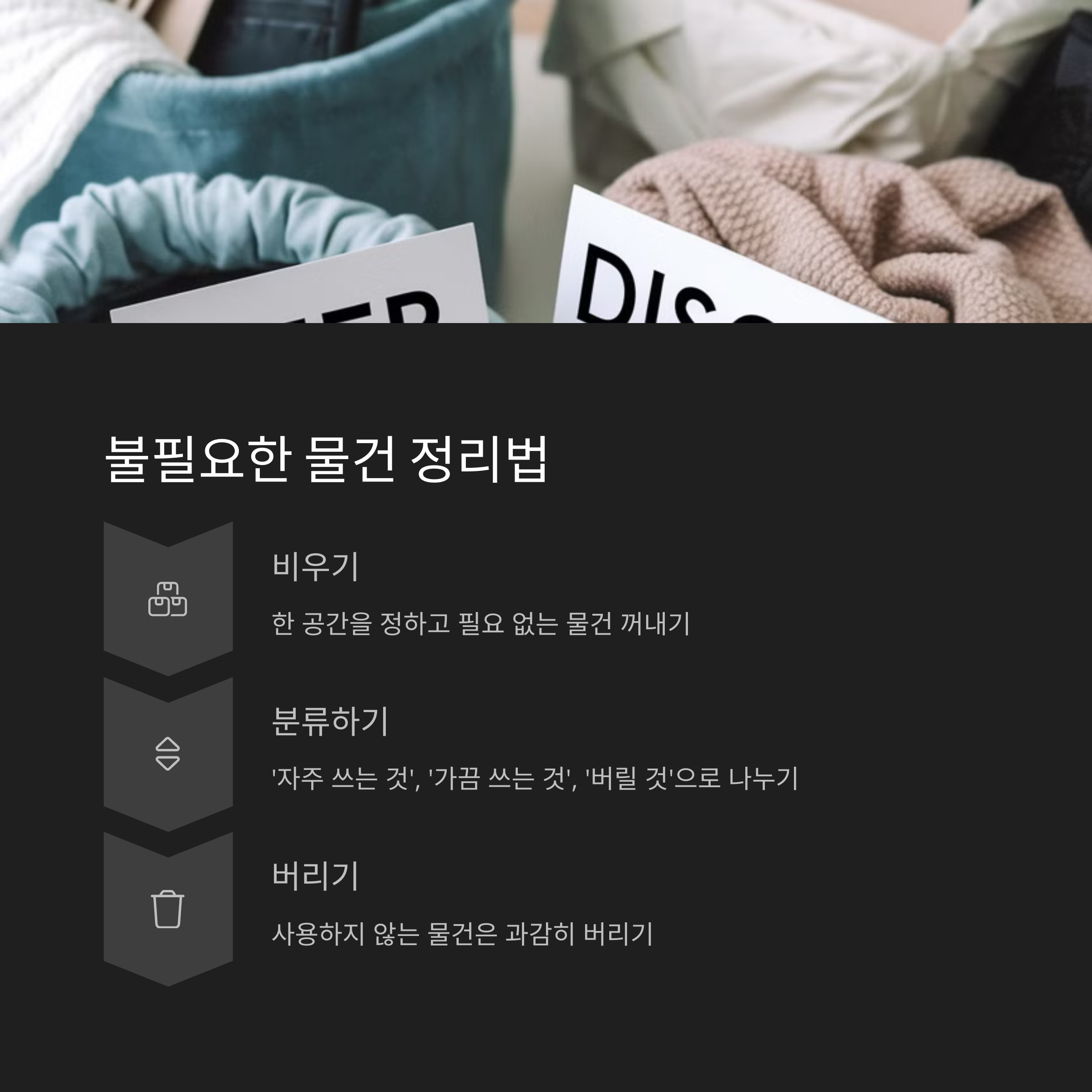 | 4단계: 버리기 | 정리 후에도 사용하지 않는 물건은 과감히 버려요. |